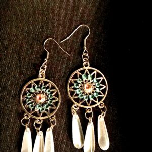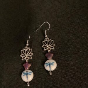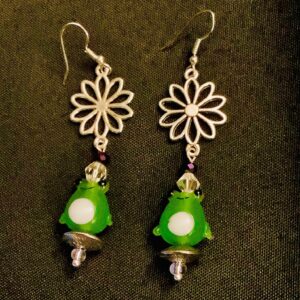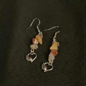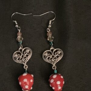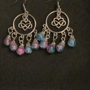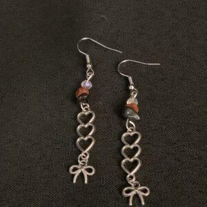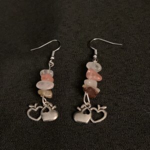 This pair features silver hearts engraved with Celtic motifs. Suspended from each heart is an Australian crystal butterfly, followed by clear faceted crystal beads and small hematite accents surrounding a charming pink glass pig bead