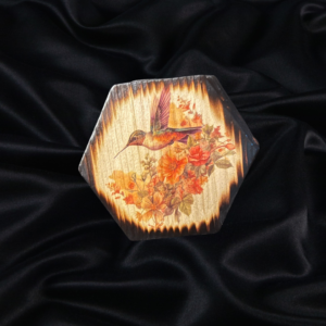 Inspired by quiet forests and gentle moments, this handcrafted hexagon coaster set features a beautifully detailed dragonfly resting among soft florals on warm, natural wood. Lightly scorched edges add rustic character while the smooth sealed surface protects your furniture in style. Both functional and decorative, these coasters bring a calm, nature-loving touch to coffee tables, desks, or gift giving. Each set is unique, making it a perfect choice for dragonfly lovers and woodland décor enthusiasts alike.